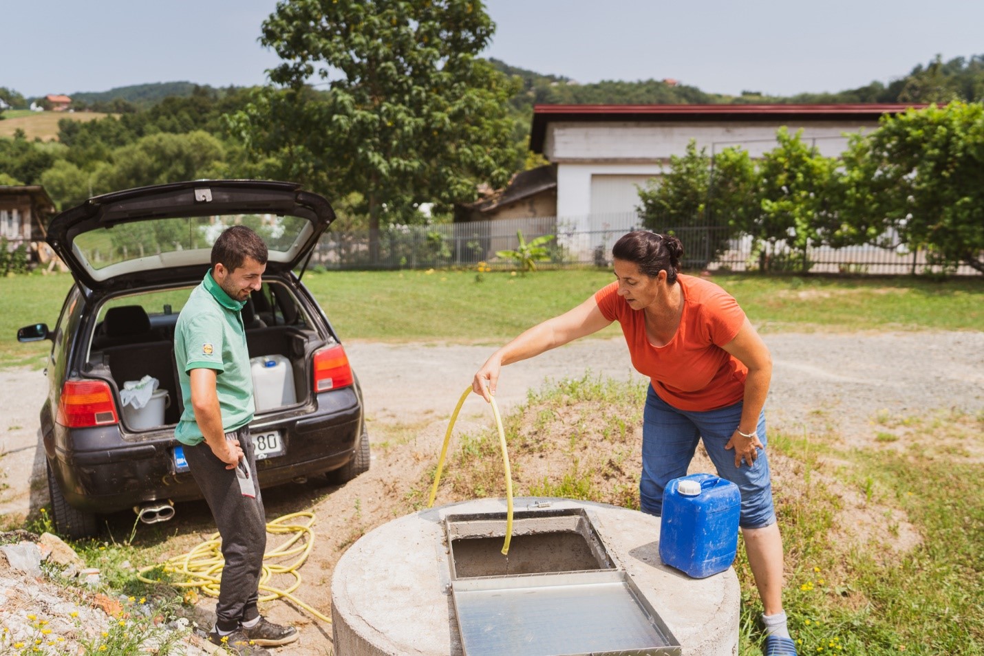 Skorom priključenju vode raduju se i Biljana Bujić i njen sin Ljubiša, koje smo zatekli kako u prazan bunar iz kanti i kanistera dosipaju vodu koju su dovukli sa tri kilometra udaljenog lokaliteta Lovačke kuće: